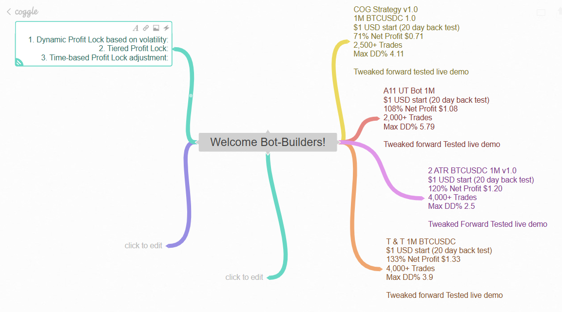 Coggle is a collaborative platform where developers can come together to brainstorm, share ideas, and work on projects in real time. It offers intuitive mind-mapping tools to visually organize test results, thoughts and concepts seamlessly. With features like live editing, version tracking, and instant sharing, teams can collaborate on code, problem-solve creatively, and contribute to a shared vision on what to try NEXT. It's perfect for fostering teamwork and turning individual ideas into collective success! Bot-Builders has it!! If you’re a developer you can ask to be invited to a private room. Everyone gets to see the Public “Read Only” room so you know exactly where, and what we are working on in REAL TIME!